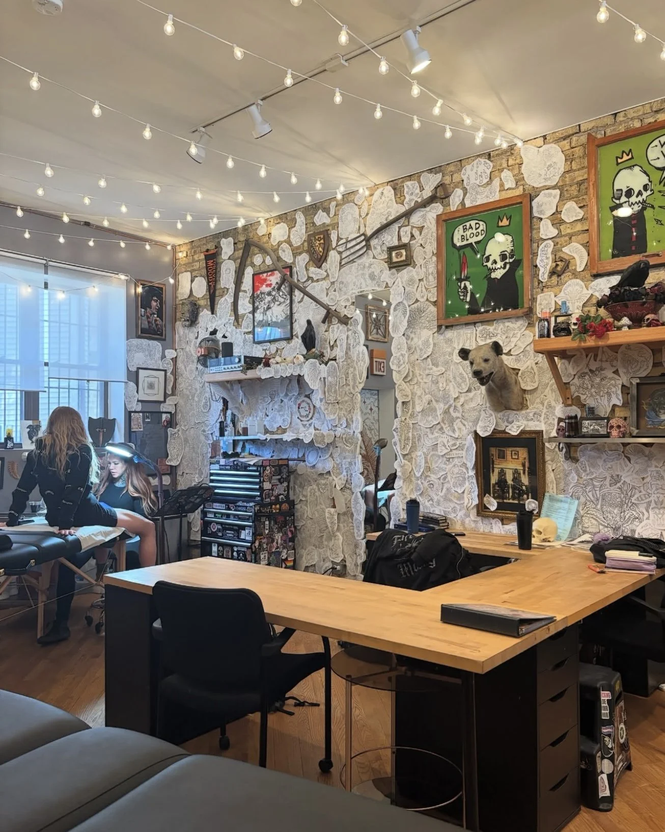 After 7 years of walk-in shops in Chicago, she went on to open Copperplate Tattoo in the spring of 2015, a private studio named for her mom’s printmaking practice of copperplate etching. It is a calm, safe, & welcoming place.